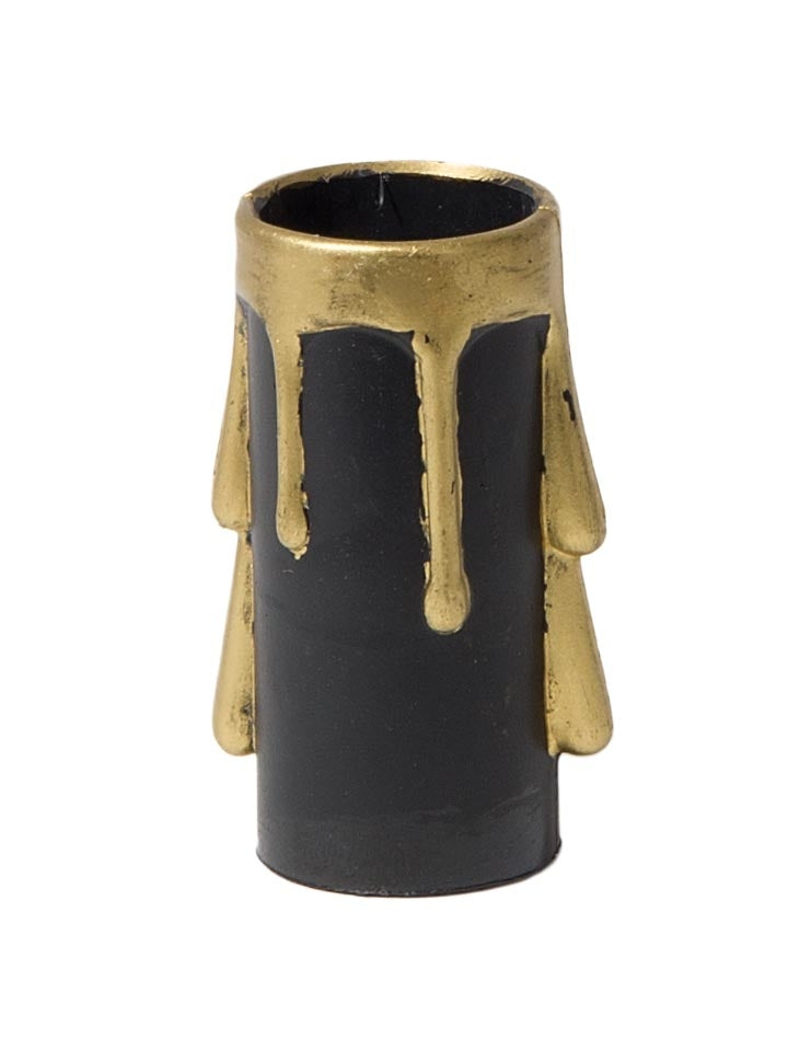 2 Inch tall candelabra base E12 size black color plastic candle cover with gold drip details.