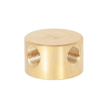 Unfinished brass straight disk arm back with 4 holes, 3 side tapped 1/8F, bottom hole tap 1/4F. Measures 3/4 inch height, 1-1/4 inch diameter.