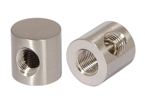 Satin nickel finish brass 2-way lamp armback. Both holes (bottom, side) tap 1/8F. Measures 3/4" height, 3/4" diameter.