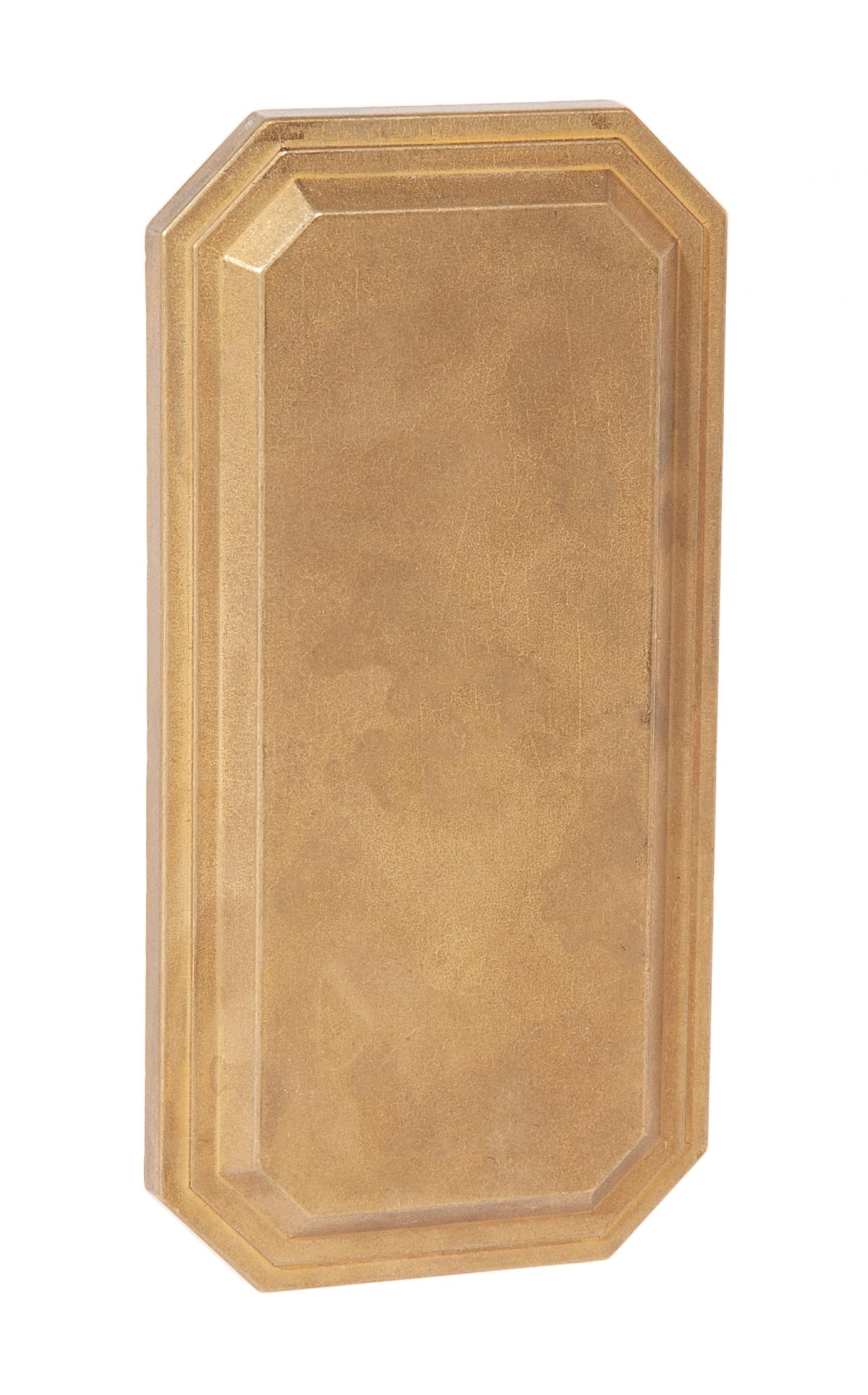 Unfinished brass die cast brass backplate. Measures 9-1/2 inch height, 4-3/4 inch wide, 11/16 inch deep. No center hole.