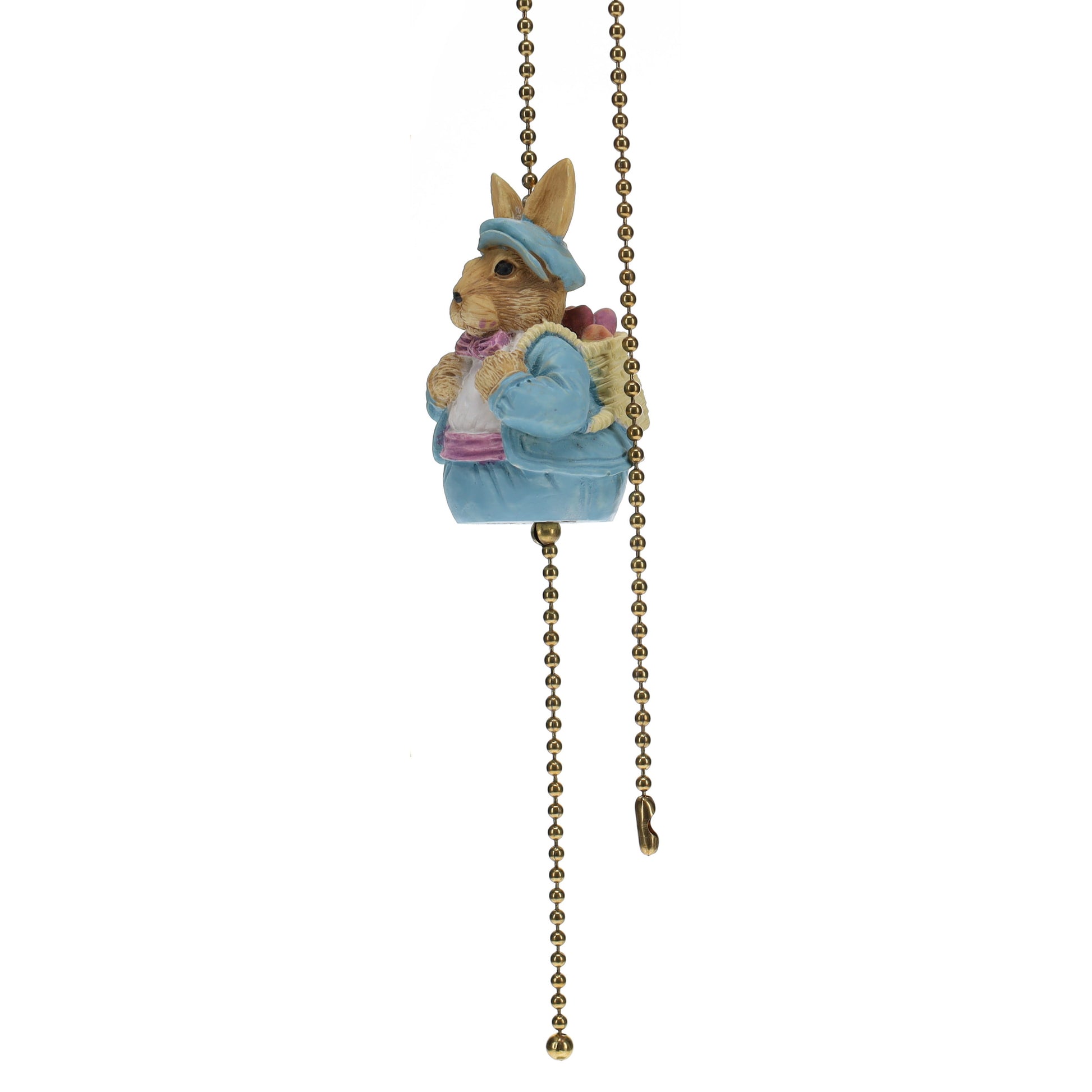 Brass Pull Chain in 18" Length with Easter Bunny carrying a pack of Easter eggs. Rabbit is hand painted ceramic. #6 Bead Chain 0.125" diameter