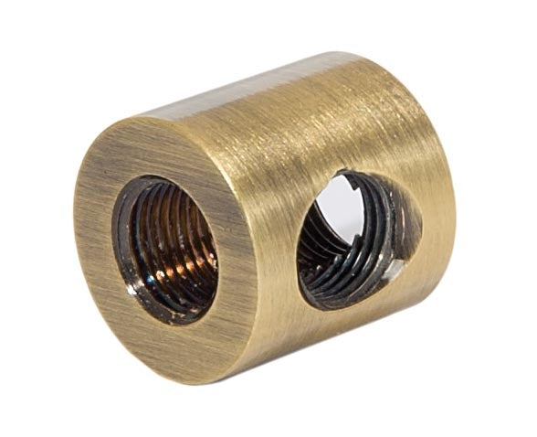 Antique brass finish brass cylinder shaped armback. Tapped 1/8F top x 1/8F bottom x 1/8F side. Measures 3/4 inch long, 3/4 inch diameter.