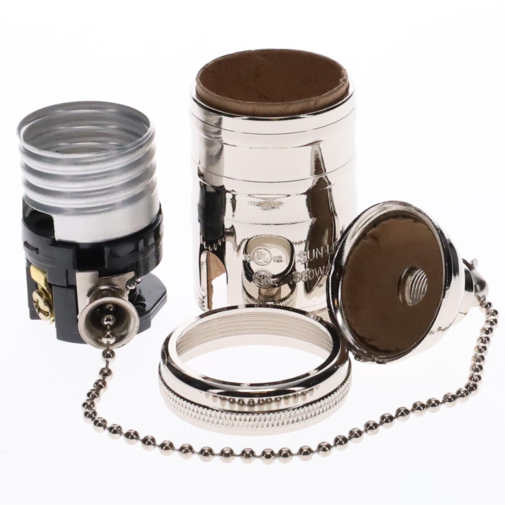Heavy Turned Brass Socket with NICKEL PLATED Finish, On/Off Pull Chain function, NO UNO threads, 1/8IP cap with set screw, 660w, 250v.