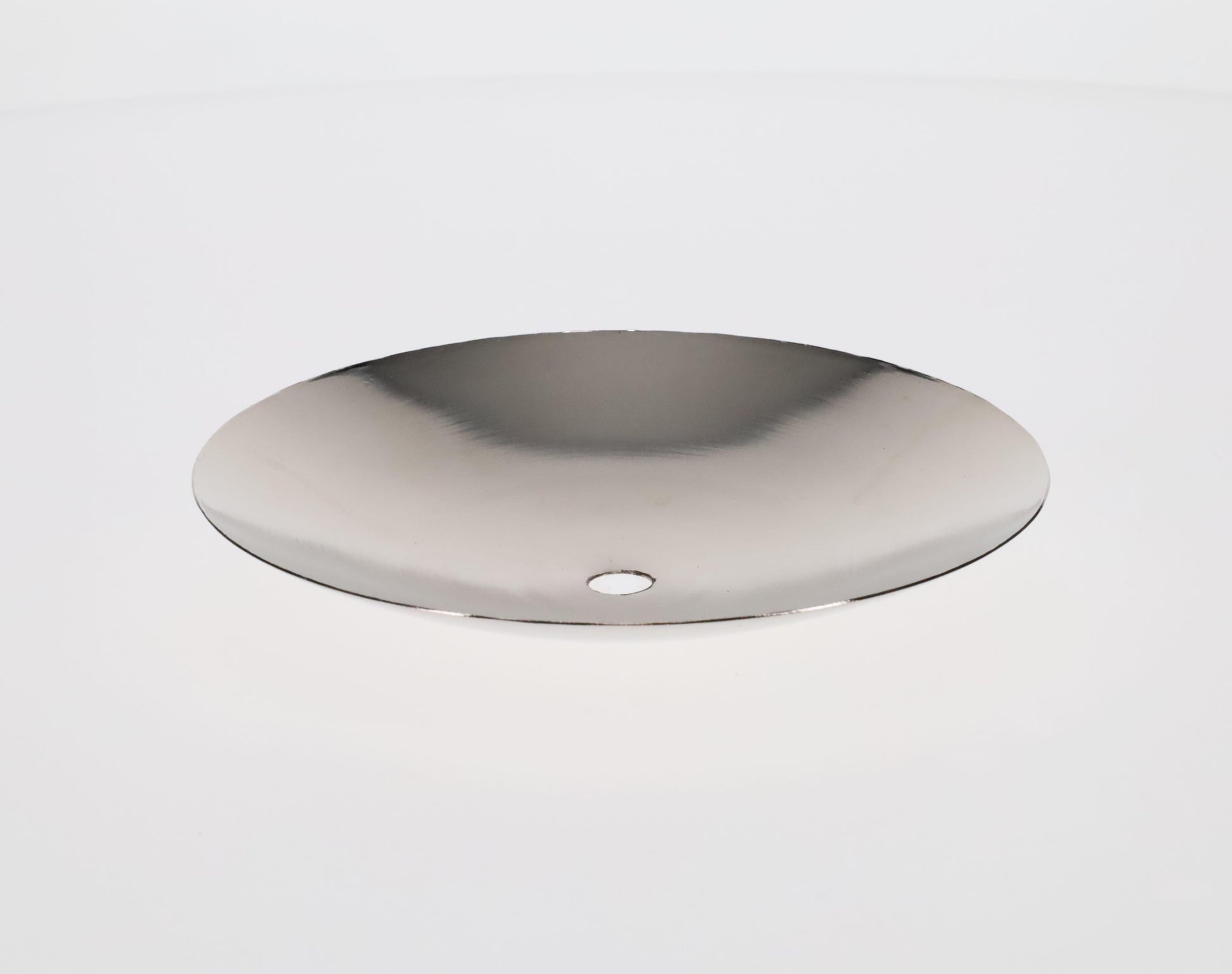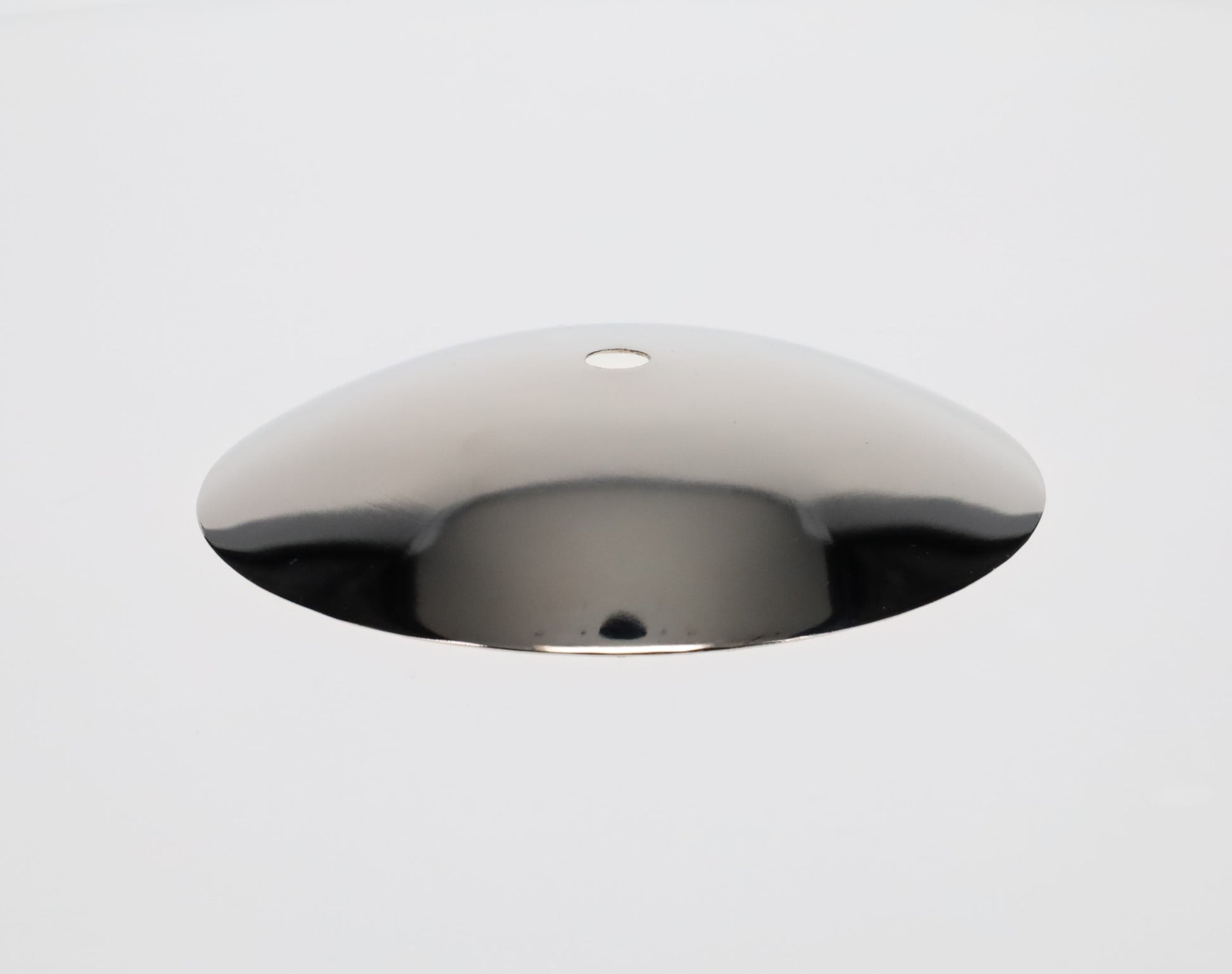 Neckless Ball Shade Cap for neckless ball shades that have 4" openings and 8" to 10" outside diameters. Cap is steel with a polished nickel finish, for outside the shade, 5-1/4" diameter x 0.84" deep cap with 1/8IP slip center hole